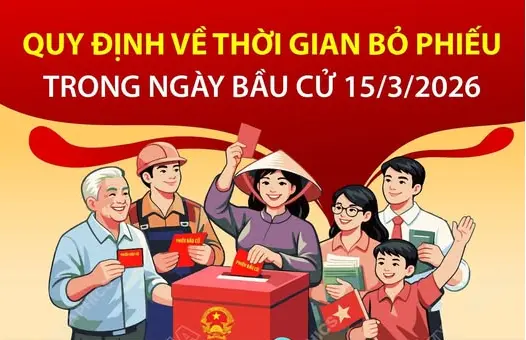 Ngày bầu cử đại biểu Quốc hội khóa XVI và đại biểu HĐND các cấp nhiệm kỳ 2026-2031 được ấn định là ngày 15/3/2026. Theo quy định, việc bỏ phiếu bắt đầu từ 7h sáng đến 7h tối cùng ngày. Tùy tình hình địa phương, Tổ bầu cử có thể quyết định cho bắt đầu việc bỏ phiếu sớm hơn nhưng không được trước 5h sáng hoặc kết thúc muộn hơn nhưng không được quá 9h tối cùng ngày.