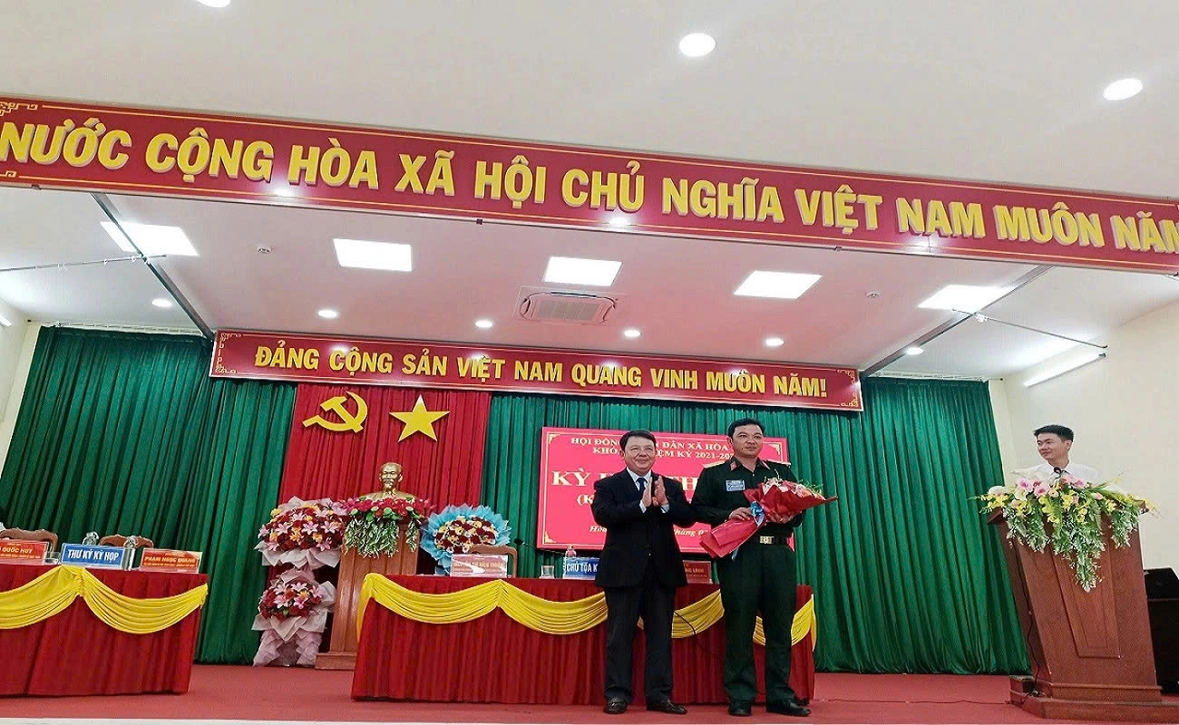 Đồng chí Đặng Hồng Lĩnh – Bí thư Đảng ủy, Chủ tịch HĐND xã tặng hoa chúc mừng đồng chí Đỗ Đức Nhuận – Chỉ huy trưởng Ban chỉ huy Quân sự xã Hòa Xuân
