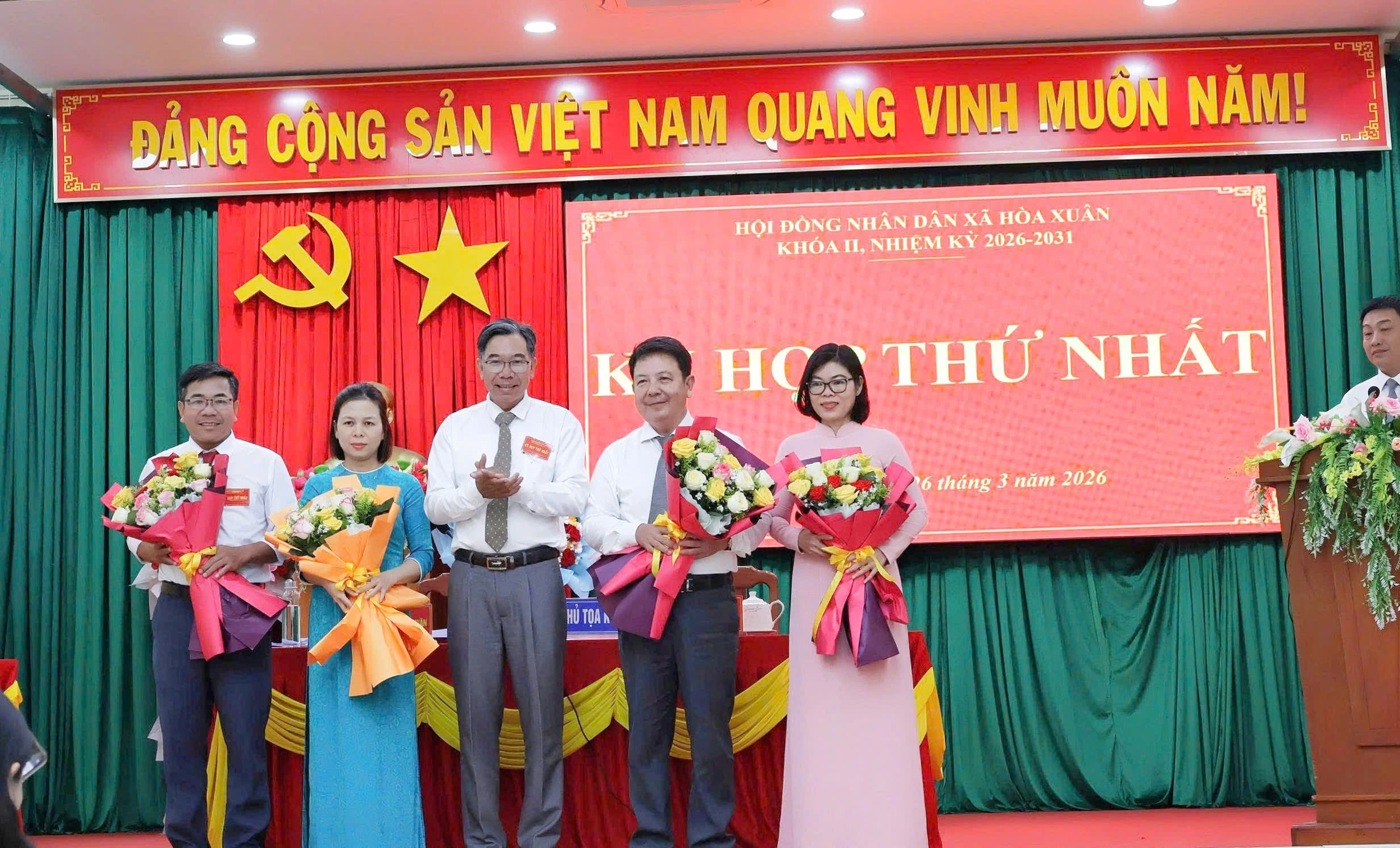 Đồng chí Lương Minh Nhất tặng hoa chúc mừng các đồng chí trúng cử HĐND xã khóa II: Đặng Hồng Lĩnh giữ chức Chủ tịch HĐND xã (thứ hai từ phải sang); Đồng chí Nguyễn Thị Bích Thuận giữ chức Phó Chủ tịch HĐND xã (thứ hai từ trái sang); Đồng chí Nguyễn Thị Lệ Hằng được bầu giữ chức Trưởng Ban Kinh tế – Ngân sách (thứ nhất từ phải sang); đồng chí Phan Tấn Nhi được bầu giữ chức Trưởng Ban Văn hóa – Xã hội (thứ nhất từ trái sang) HĐND xã khóa II, nhiệm kỳ 2026 – 2031