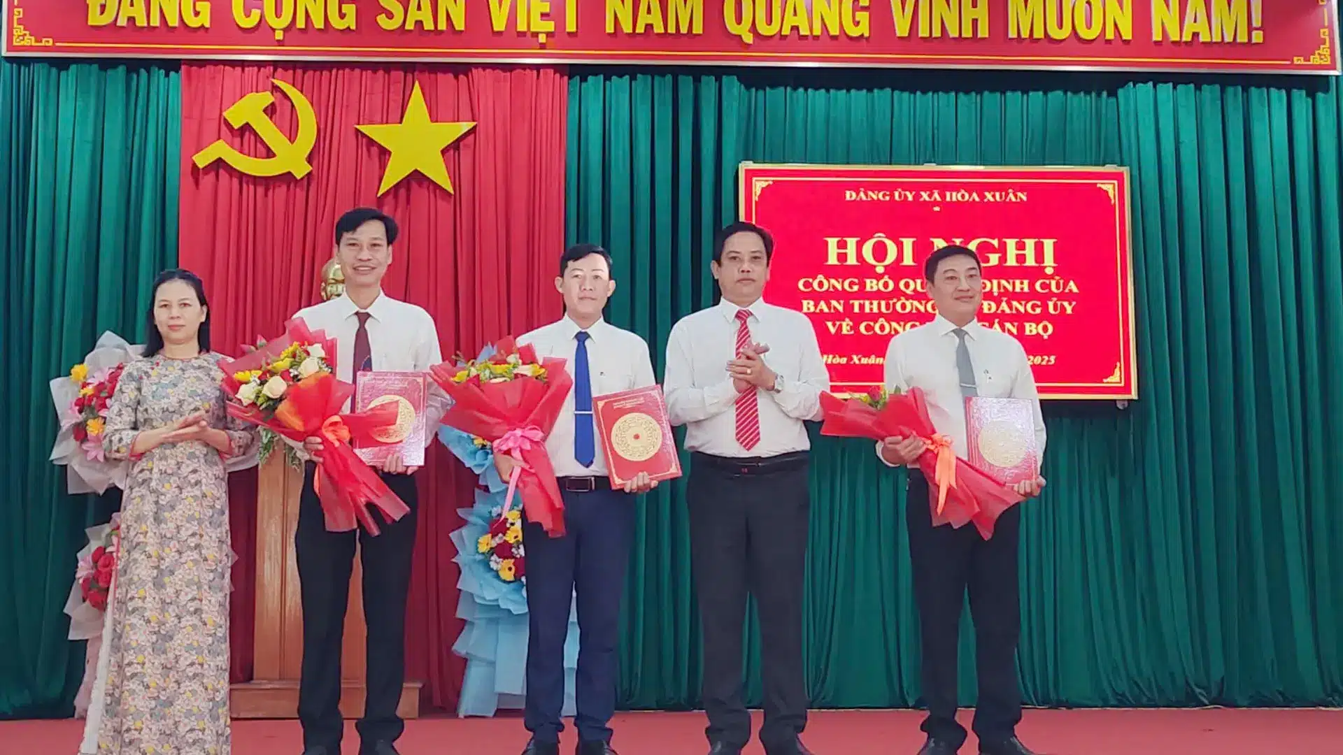 Bí thư Đảng ủy xã Hòa Xuân Đặng Hồng Lĩnh và Phó Bí thư Thường trực Đảng ủy Lương Minh Nhất trao quyết định cho cán bộ được bổ nhiệm