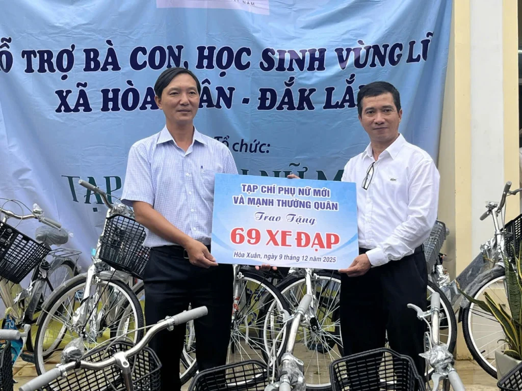 Đại diện Tạp chí Phụ nữ Mới trao tặng xe đạp cho học sinh xã Hòa Xuân