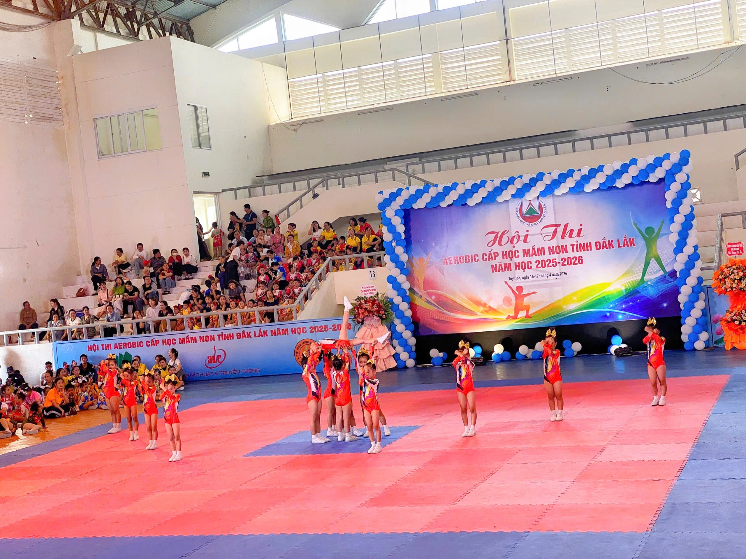 Ngày 17/4/2026, tại Nhà Văn hóa Lao động, Phường Tuy Hòa, Hội thi Aerobic cấp học mầm non tỉnh Đắk Lắk năm học 2025–2026 khu vực phía Đông đã diễn ra sôi nổi với sự tham gia của 38 đội thi đến từ các cơ sở giáo dục mầm non trên địa bàn. Đây là hoạt động thiết thực nhằm đẩy mạnh phong trào rèn luyện thể chất trong trường học, góp phần nâng cao chất lượng chăm sóc, giáo dục trẻ mầm non.